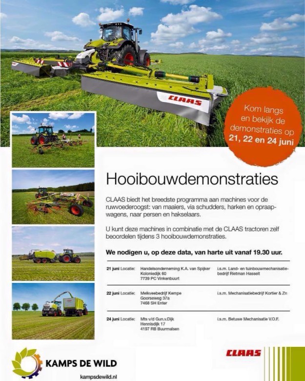 De CLAAS Hooibouwdemonstraties 2016 komen er aan ! CLAAS biedt het breedste programma aan machines voor de ruwvoederoogst: van maaiers, via schudders, harken en opraapwagens, naar persen en hakselaars. U kunt deze machines in combinatie met de CLAAS tractoren zelf beoordelen tijdens 3 hooibouwdemonstraties. Wij nodigen u uit om daar de claas hooibouwlijn en diverse…