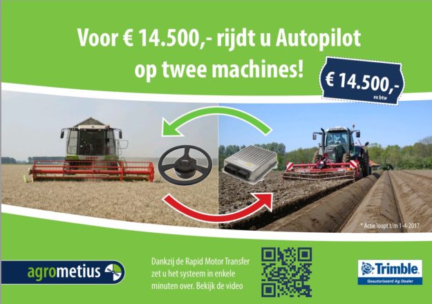 Agrometius introduceert de Rapid Motor Transfer (RMT). Dit is een snelwisselsysteem voor de Trimble stuurmotor die onderdeel uitmaakt van het EZ-Pilot en Autopilot Motordrive systeem. Het overbouwen van de stuurmotor is nu slechts enkele minuten werk en zo eenvoudig uit te wissel met uw andere machines. Ter introductie van de Rapid Motor Transfer heeft Agrometius tijdelijk een…