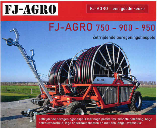 FJ-Agro is een Deens merk van zelfrijdende beregeningshaspels. De haspel volgt de slang, waardoor deze in bochten gelegd kan worden en de totale lengte van de slang benut kan worden. De machines zijn d.m.v. een turbine aangedreven en de slanglengtes variëren tussen de 300 en 1100 m. De slangdiameters zijn er in 100mm, 110mm en…